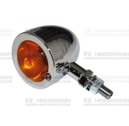 Kierunkowskaz BULLET z okrągłą bursztynową płaską soczewką. Chromowana metalowa obudowa.