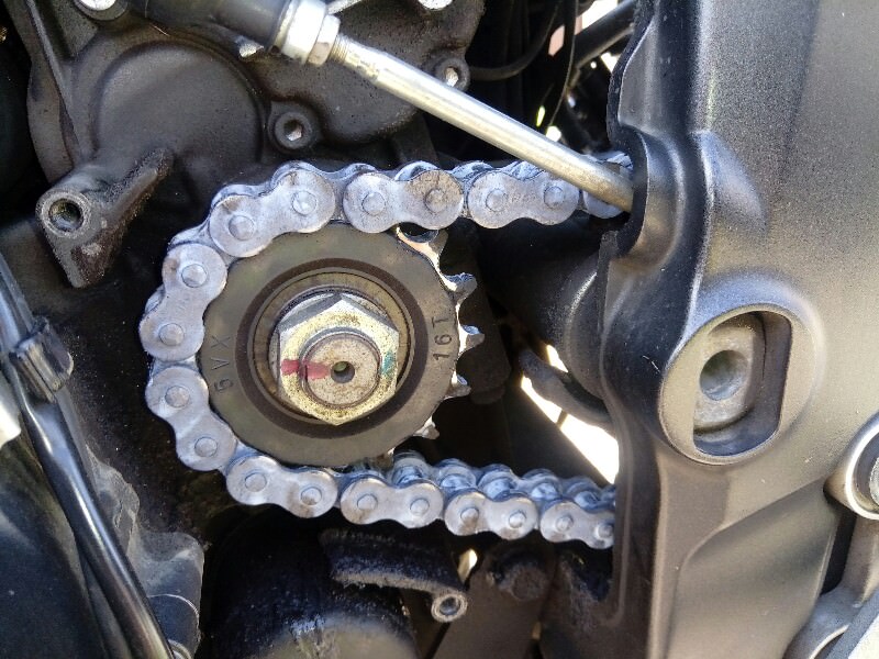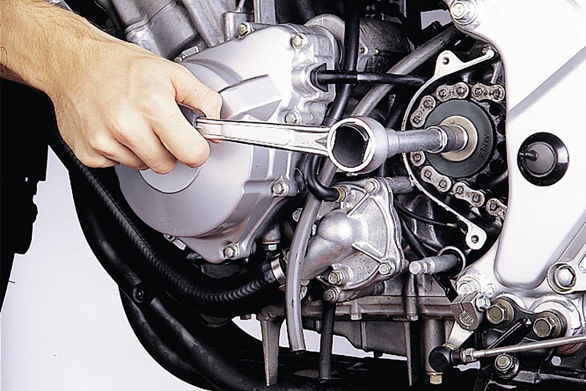 1. Poluzuj, zdejmcie karter zabezpieczający zębatkę zdawcza (małą) Aby dostać się do zębatki, może być konieczne zdjęcie podnóżka, dźwigni zmiany biegów (zwróć uwagę na położenie!) I osłony kartera. Podnosząc osłonę zwróć uwagę na ewentualne załączenie sprzęgła - jeśli to możliwe, nie odczepiaj go. Aby zabezpieczyć pojazd, włącz pierwszy bieg i zablokuj pedał hamulca , aby zwolnić wałek zdawczy przedniej zębatki. Koło zębate można mocować na różne sposoby (nakrętka centralna z płytką blokującą, śruba centralna z płytką blokującą, płytka ustalająca dwoma mniejszymi śrubami). W razie potrzeby najpierw zdjąć zabezpieczające podkładki, ring bezpieczeństwa śruby (np. Zagiąć, od giąć płytkę, podkładkę blokującą), a następnie poluzować śrubę mocującą lub nakrętkę ziębnika odpowiednim kluczem nasadowym i w razie potrzeby zastosować odpowiednią siłę przedłużając ramie klucza nasadowego.