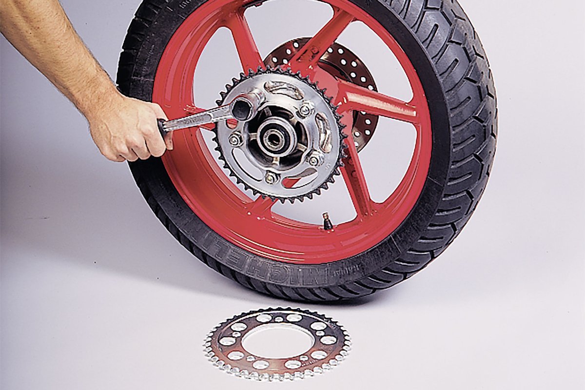 3. Wymień zębatkę (dożą), odkręć zębatkę od nośnika zębatki na tylnym kole czyli od felgi motocykla.. Tutaj również należy wcześniej odchylić wszystkie płytki blokujące, podkładki ‚śrub, czy inne zabezpieczenia gwintu śrub. Należy wymienić podkładki zabezpieczające lub nakrętki samo zabezpieczające. Oczyść zabierak i załóż nową zębatkę. Dokręć śruby na krzyż, jeśli to możliwe, za pomocą klucza dynamometrycznego zgodnie z instrukcjami producenta. W razie potrzeby ponownie ostrożnie wywinąć lub wygiąć płytki blokujące zabezpieczenia śrub. Teraz sprawdź ponownie koło: czy wszystkie łożyska i pierścienie uszczelniające robią dobre wrażenie? Wymień uszkodzone części!.