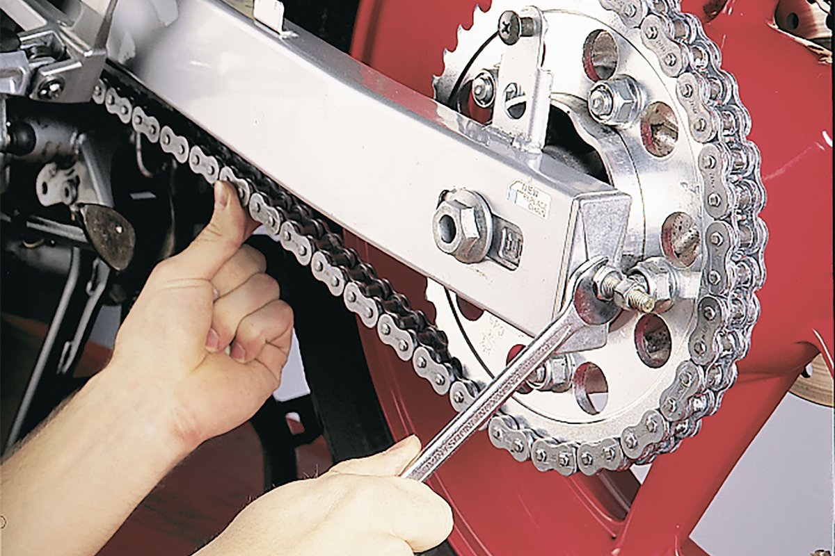 9. Wyreguluj napięcie łańcucha Teraz już prawie gotowe, ostatnie kroki: wyreguluj luz / luz łańcucha w następujący sposób: zakręć ręcznie tylnym kołem i określ najściślejszy punkt - jest to ważne, ponieważ zbyt napięty łańcuch zepsuje łożysko wyjściowe przekładni i będzie naprawdę to drogi wydatek. Luz zalecany, prawie na 2 palce w miejscu pośrodku dolnego luzu łańcucha, gdy pojazd jest załadowany i stoi na ziemi, jest standardem. Do testu najlepiej jest usiąść na motocyklu i poprosić o sprawdzenie luzu drugiej osoby. Luz jest regulowany za pomocą mechanizmu regulacyjnego po zwolnieniu osi i podniesieniu motocykla. Ważne jest, aby wyregulować równomiernie po obu stronach wahacza, aby utrzymać wyrównanie koło po środku osi kierunku jazdy. W razie wątpliwości za pomocą testera wyrównania łańcucha (w naszej ofercie znajdziecie laser do pozycjonowania łańcucha motocyklowego),domowy sposób jest użycie długiej, prostej listwy lub sznurka. Proszę wziąć pod uwagę, że łańcuchy, które są zbyt napięte, zużyte lub źle utrzymane, mogą pęknąć, blokować, zerwać się - zwykle skutkuje to zgnieceniem obudowy silnika, wyrwaniem katera zębatki zdawczej jeśli nie upadkiem i nie tylko! Chain Laser może być pomocny podczas napinania łańcucha i to polecamy.
