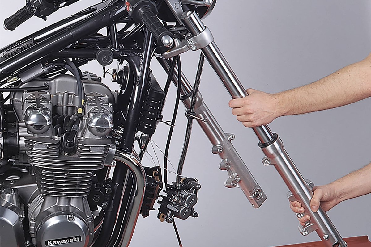 Przed podniesieniem przedniej części motocykla za pomocą odpowiedniego podnośnika należy poluzować zaślepki (korki) gwintowane rur widelca. Aluminiowe korki to bardzo miękki materiał, musisz dobrze dobrać wielkość klucza nasadowego i najlepiej jak się nie omsknie, jeśli się tak wydarzy nie będzie tanio. Nowe zaślepki kosztują słono u dilera danej marki motocykla. Aby to zrobić, należy poluzować zaciski i śruby na górnej półce motocykla, aby za chwilę wysunąć całe widelce lagi, kładąc je na stół warsztatowy.