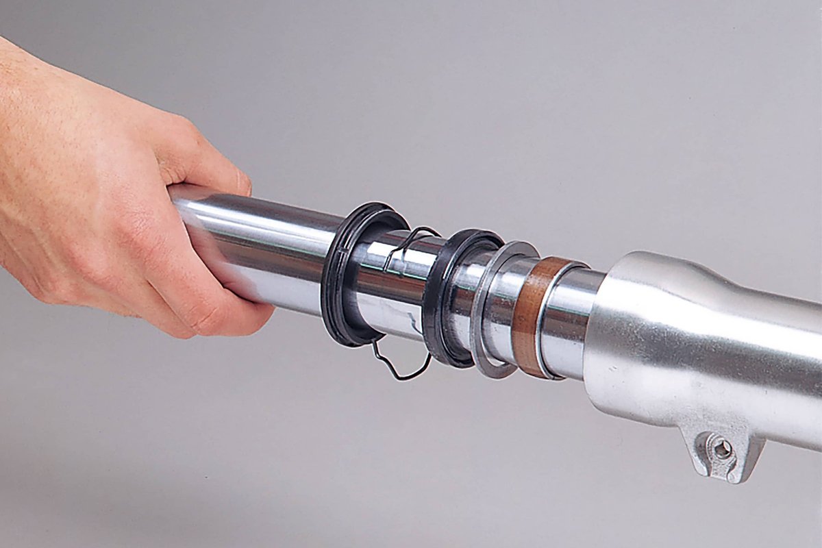Przed założeniem nowego pierścienia uszczelniającego należy go lekko nasmarować, a mianowicie raz na powierzchni zewnętrznej, aby ułatwić wsunięcie do rurki zanurzeniowej, a następnie na wargę uszczelniającą, aby nie uszkodzić jej podczas montażu. Do włożenia pierścienia uszczelniającego można użyć odpowiedniej rury lub, jeszcze lepiej, profesjonalnego wkrętaka do uszczelek widelca. Jako podstawę do pierwszych uderzeń najlepiej użyć starego pierścienia uszczelniającego. Do wbicia pierścienia uszczelniającego widelca nie jest wymagana duża siła. Pod żadnym pozorem nie używaj ostrych przedmiotów, które mogą uszkodzić pierścień. Pierścień uszczelniający jest wciskany do momentu, gdy będzie można go wcisnąć w rowek śrubokrętem.
