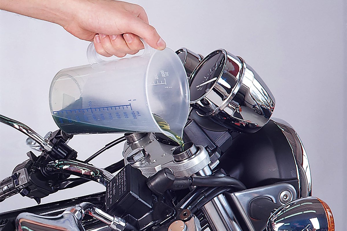 W zależności od preferencji, nogi wideł (lagi przednie) można napełnić olejem do widelców na stole warsztatowym lub w pojeździe. Najważniejsza jest właściwa lepkość i dokładnie takie same ilości (przeczytaj książkę serwisową ile oleju na każdą lagę jest zalecane, miarka i ewentualnie lejek zapewniają bezpieczne napełnianie. Jeśli widelec dobrze pracuje podczas gwałtownego hamowania, nie ma sensu wlewać oleju innej lepkość! Sprężyny widelca, olej w widelcu są odpowiedzialne tylko za tłumienie. Wrodzone wady podwozia niektórych motocykli można naprawić, na przykład, sprężynami widelca firmy Promoto Wilbers. Sprężyny progresywne, są stopniowo zwijane i około 30% twardsze niż oryginały. W przypadku wideł ze wspomaganiem pneumatycznym sprężyny Wilbers mogą nawet częściowo lub całkowicie zrezygnować z powietrza, które jest za delikatne dla pierścieni uszczelniających.